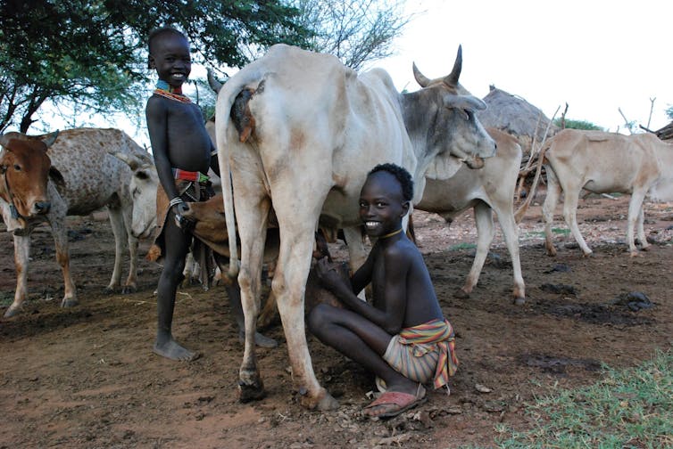 Hamar children milk one of their family’s cattle. J. Dubosson, Author provided