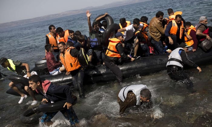 Refugees arrive on the shores of the Greek island of Lesbos after crossing from Turkey in a dinghy. Photograph: Angelos Tzortzinis/AFP/Getty Images